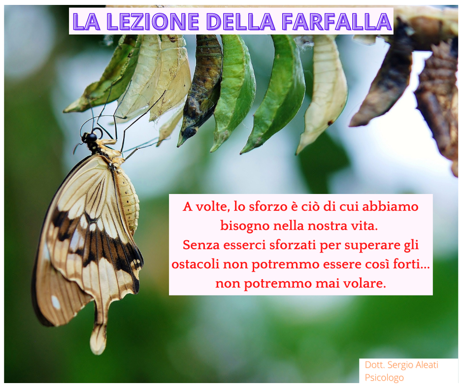 Quell’uomo, con il suo gesto di gentilezza e con l’intenzione di aiutare, al momento non vide che passare per lo stretto buco del bozzolo era lo sforzo necessario affinchĆ© la farfalla potesse trasmettere il suo fluido corporeo alle ali.